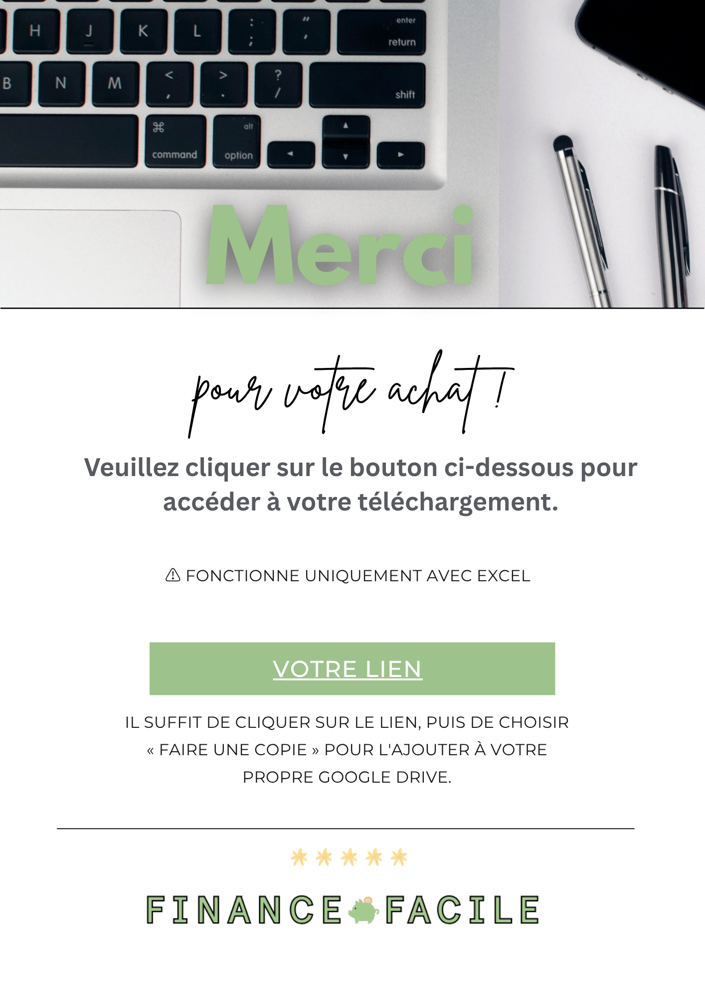 Une fois votre achat confirmé, vous recevrez un fichier PDF élégant et personnalisé signé Finance Facile.